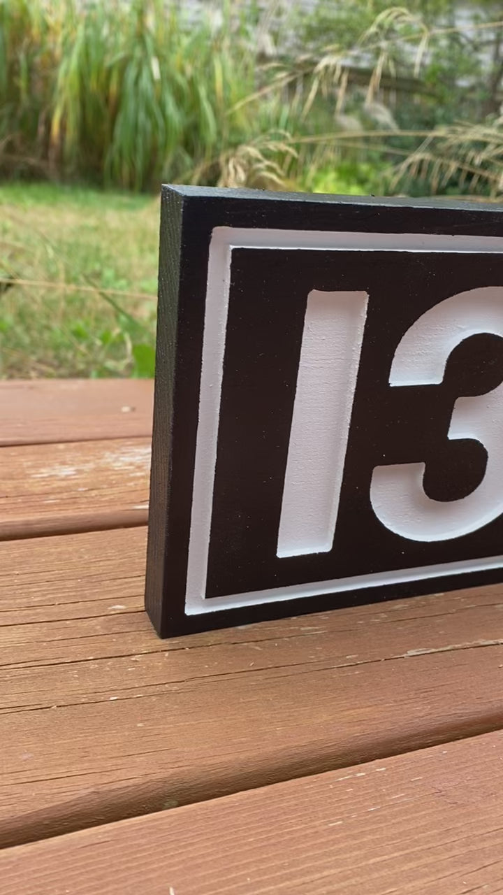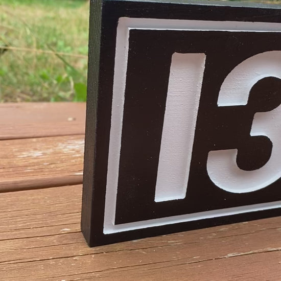 Custom, carved rectangle address sign, made from solid pine, sealed with a sanding sealer and painted with 2 coats of exterior paint. ~15.5" wide. Multiple size & color options available.