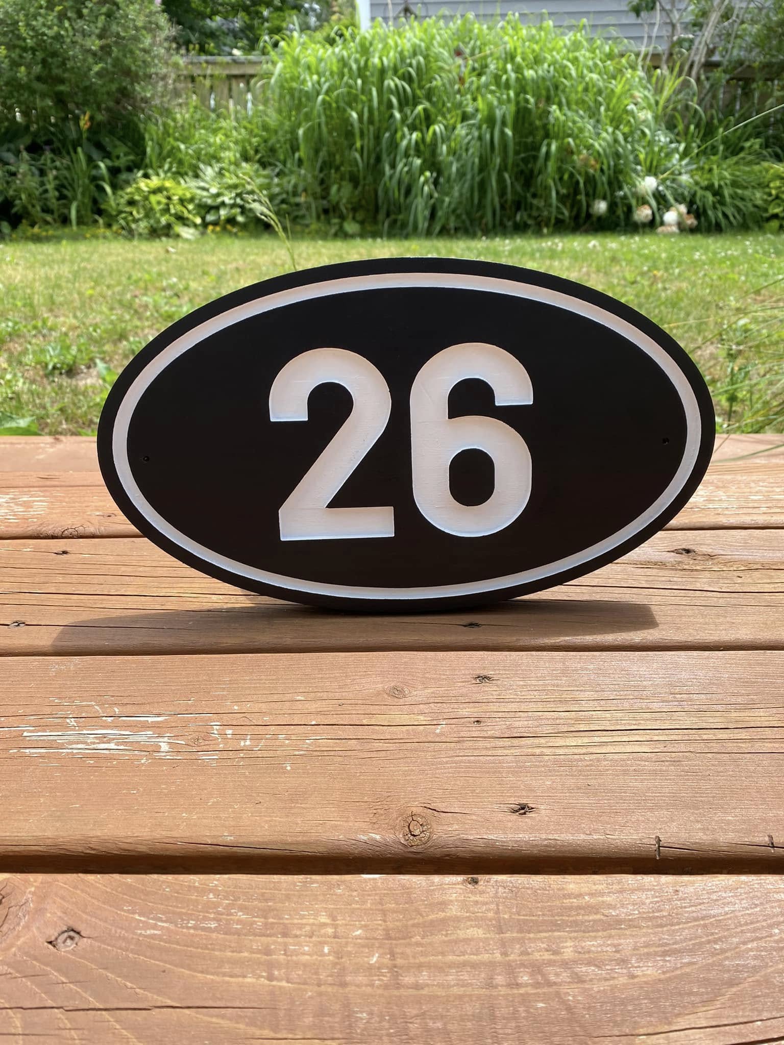 Custom, carved oval address sign, made from solid pine, sealed with a sanding sealer and painted with 2 coats of exterior paint. ~13.5" wide. Multiple color options available.